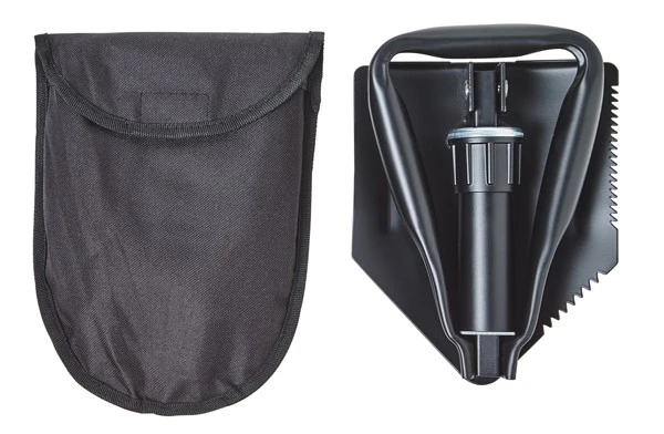 En acier, compact une fois plié, 2 côtés dentelés et un housse de transport.