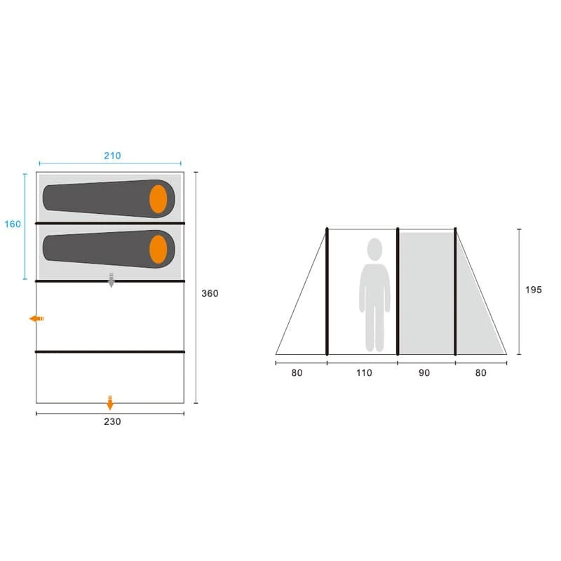 La tente dispose de deux entrées pour plus de confort, toutes deux composées d’une porte et d’une moustiquaire. Les deux entrées permettent une meilleure aération de la tente et une meilleure circulation à l’intérieur.